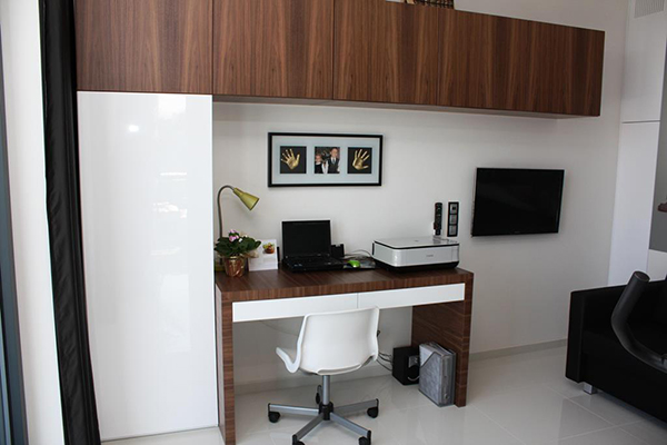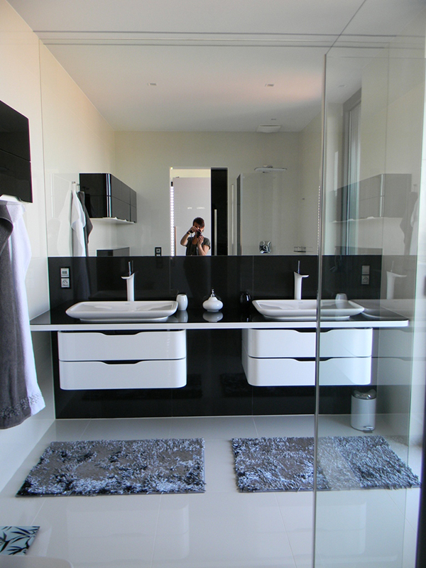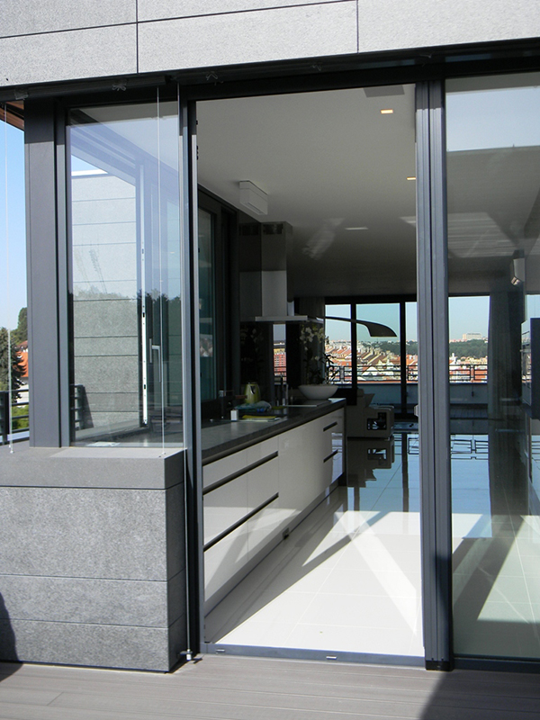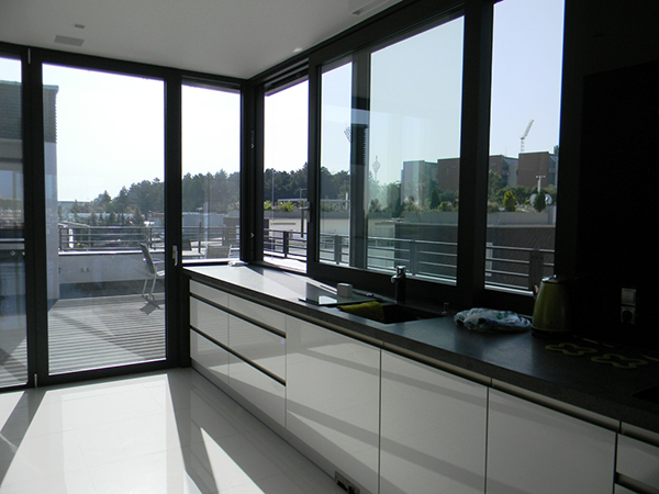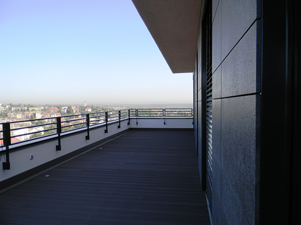 Prosluněný byt v posledním nadzemním podlaží nového bytového domu disponuje plochou téměř 200m2 a terasami obrácenými do tří světových stran s výhledem na Prahu. Napojení všech obytných místností na terasy je určující pro charakter celého bytu. Maximálního prosvětlení prostoru bylo dosaženo i díky velkoformátové leštěné dlažbě a kuchyni i nábytku ve vysokolesku.